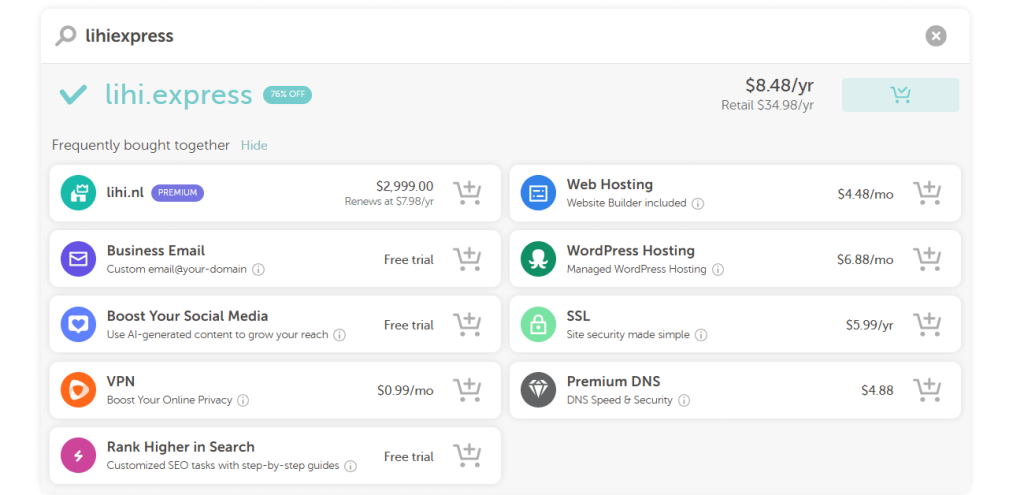 在搜尋欄位輸入想要的名字,如果顯示為綠色,代表能購買,想要的名字被註冊的話,能重新取個名字,一般會選擇.com、.tw,有特殊需求,往下滑就能看到其他org、net等,費用落在400~1000元,依照個人喜好選擇。