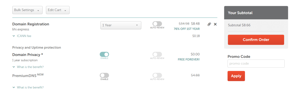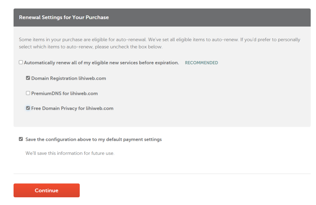 Domain Privacy : 設定網址的隱私權,Namecheap提供免費功能,通常是另外付費,同樣可開啟自動續約。