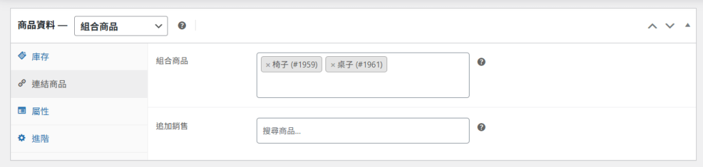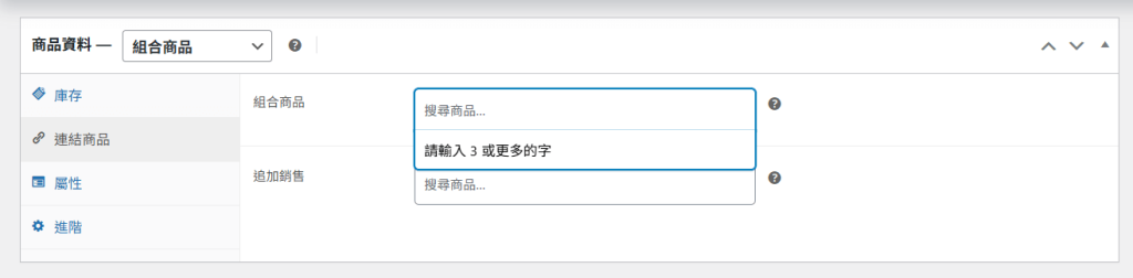點選WooCommerce設定組合商品,記得把商品類型設定完成,之後就能正常加入購物車,操作步驟➝「新增商品」➝「商品資料」➝「組合商品」。